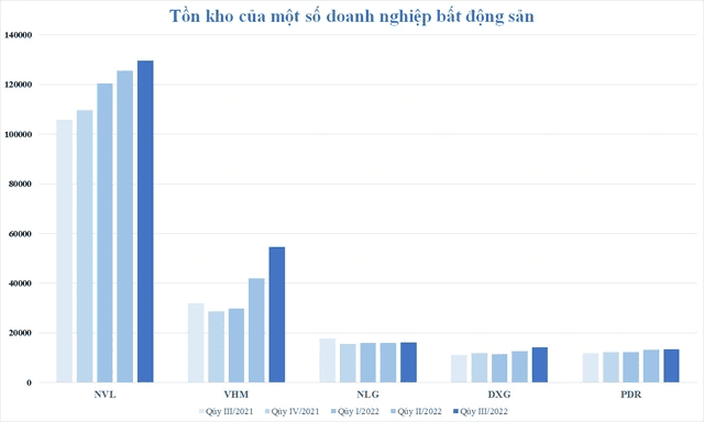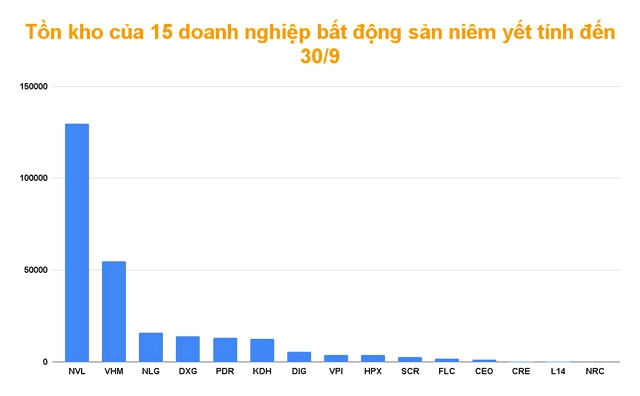 Thống kê đến ngày 30/9, Theo số liệu từ 15 doanh nghiệp bất động sản lớn được niêm yết trên sàn chứng khoán gồm Công ty Cổ phần Tập đoàn Đầu tư Địa ốc No Va, Vinhomes, Tập đoàn Nam Long, Tập đoàn Đất Xanh, CTCP Phát triển Bất động sản Phát Đạt, CTCP Đầu tư và Kinh doanh Nhà Khang Điền, Tổng Công ty Cổ phần Đầu tư Phát triển Xây dựng, Văn Phú Invest, CTCP Đầu tư Hải Phát, CTCP Địa ốc Sài Gòn Thương Tín, CTCP Tập đoàn FLC, CTCP Tập đoàn CEO, CTCP Bất động sản Thế Kỷ, Công ty cổ phần Licogi 14, Tập Đoàn Danh Khôi. Cho thấy, tổng lượng tồn kho là gần 261.000 tỷ đồng, tương đương 10,4 tỷ USD, tăng gần 7,4% so với quý trước và tăng hơn 28% so với cùng kỳ.