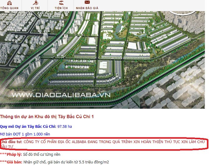 phanh phui tự xưng là chủ đầu tư dự án Tây Bắc Củ Chi. (Ảnh chụp website diaocalibaba.vn)