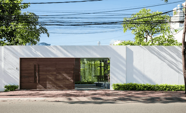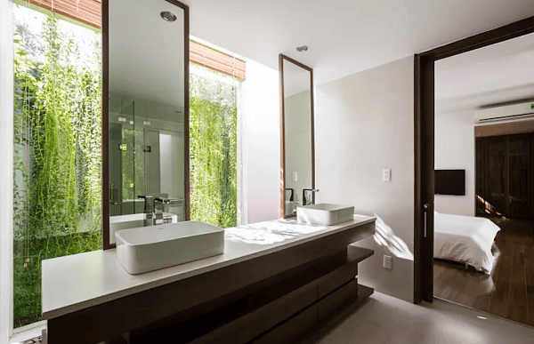 Các căn phòng trong nhà được thiết kế dạng hộc kéo, khi kéo ra để lại các khoảng trống, đó là những hành lang xanh với dây leo kín tường. Các kiến trúc sư đã tối giản số lượng màu sắc sử dụng ở đây bằng cách sử dụng sơn tường màu trắng và vách ngăn là các cột gỗ để làm nổi bật lên khoảng tường xanh mướt mát.
