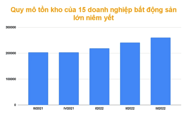 Thống kê đến ngày 30/9, Theo số liệu từ 15 doanh nghiệp bất động sản lớn được niêm yết trên sàn chứng khoán gồm Công ty Cổ phần Tập đoàn Đầu tư Địa ốc No Va, Vinhomes, Tập đoàn Nam Long, Tập đoàn Đất Xanh, CTCP Phát triển Bất động sản Phát Đạt, CTCP Đầu tư và Kinh doanh Nhà Khang Điền, Tổng Công ty Cổ phần Đầu tư Phát triển Xây dựng, Văn Phú Invest, CTCP Đầu tư Hải Phát, CTCP Địa ốc Sài Gòn Thương Tín, CTCP Tập đoàn FLC, CTCP Tập đoàn CEO, CTCP Bất động sản Thế Kỷ, Công ty cổ phần Licogi 14, Tập Đoàn Danh Khôi. Cho thấy, tổng lượng tồn kho là gần 261.000 tỷ đồng, tương đương 10,4 tỷ USD, tăng gần 7,4% so với quý trước và tăng hơn 28% so với cùng kỳ.
